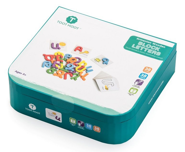 A fun and exploratory way to teach children the alphabet. A toy that is designed to encourage fine motor and visual perception sills. This set of Armenian letters comes with 38 wooden letters, 38 double sided cards, and a durable box for storage. One side of the card has a letter and an image in order to use as a reference in finding the corresponding block letter. While the other side just has the letter.