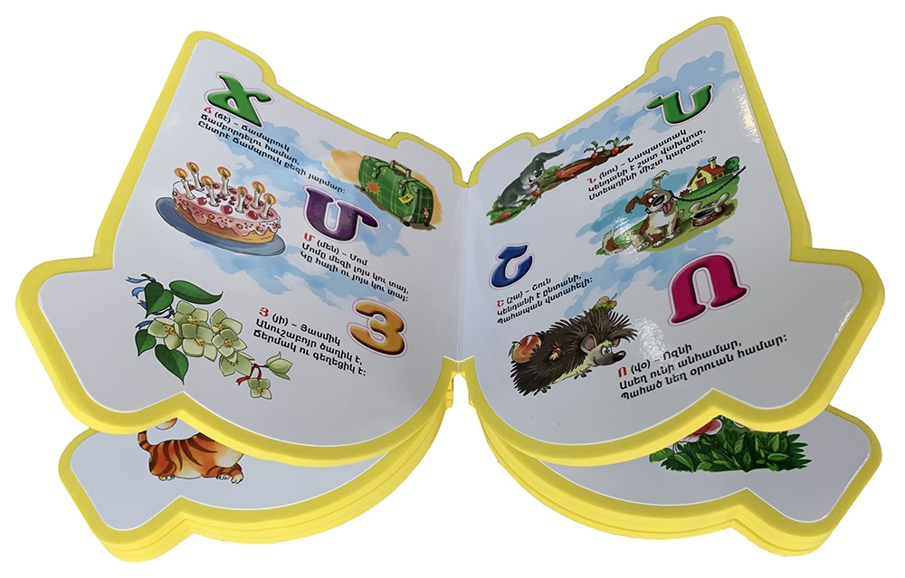 A Western Armenian alphabet book in the shape of the letter Ayp in Armenian. It is made out of foam and presents each letter of the alphabet along with an image, a word and a sentence with the word. Perfect for children 2-5.