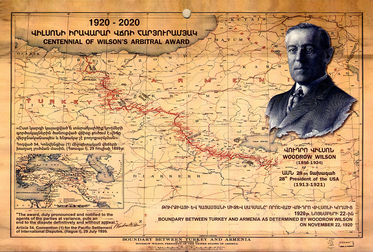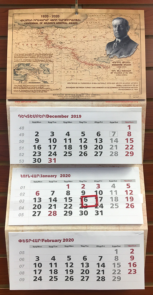 Drop down bilingual calendar dedicated to Woodrow Wilson's Arbitral Award of 1920, setting the boundaries between Turkey and Armenia defined more accurately to the historic land belonging to Armenia. Calendar is divided into three sections to view both the previous month and the upcoming month.