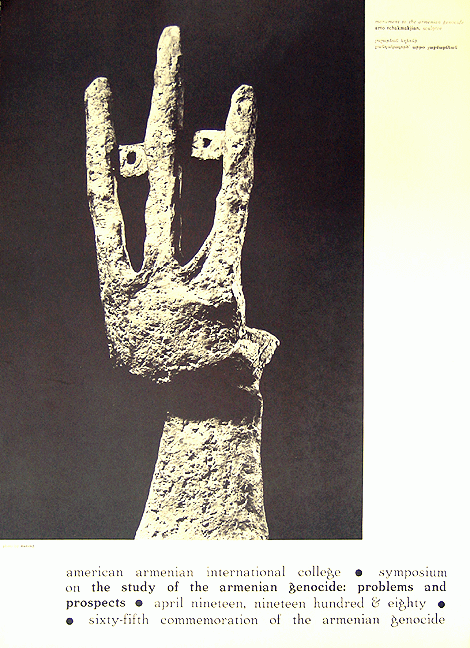 Poster of the "Symposium on the Study of the Armenian Genocide: Problems and Prospects" held on April 19, 1980 in honor of the 65th commemoration of the Armenian Genocide. Presents a photo of the sculpture entitled, "Monument of the Armenian Genocide" by artist Arto Tchakmakjian.