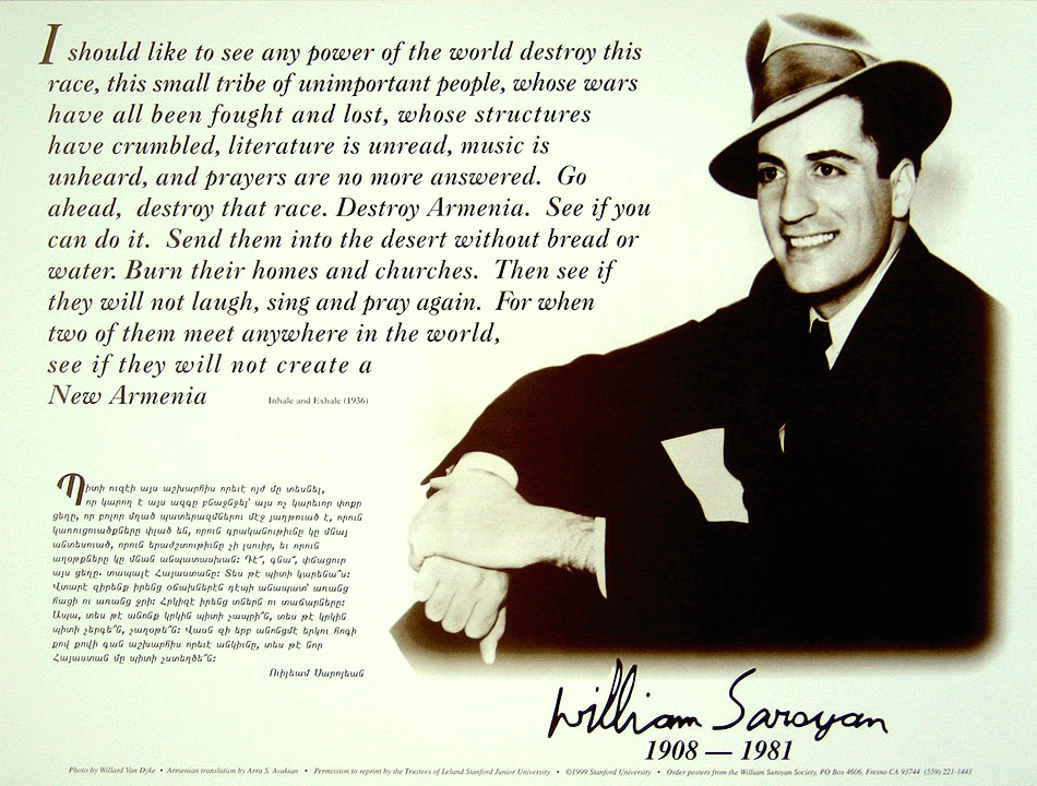 Presents a photo of the young William Saroyan taken by Willard Van Dyke with his most famous quote in English and translated into Western Armenian by Arra S. Avakian: "I should like to see any power of the world destroy this race, this small tribe of unimportant people, whose wars have all been fought and lost, whose structures have crumbled, literature is unread, music is unheard, and prayers are no more answered. Go ahead, destroy Armenia. See if you can do it. Send them to the desert without bread or water. Burn their homes and churches. Then see if they will not laugh, sing and pray again. For when two of them meet anywhere in the world, see if they will not create a New Armenia."