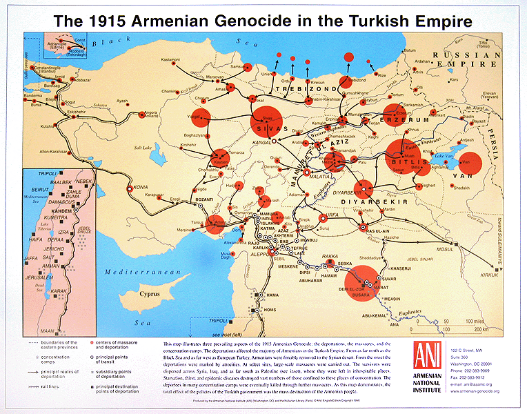 This folded map illustrates three prevailing aspects of the 1915 Armenian Genocide: the deportations, the massacres, and the concentration camps. The deportations affected the majority of the Armenians in the Turkish Empire. From as far north as the Black Sea and as far west as European Turkey, Armenians were forcibly removed to the Syrian desert. From the onset the deportations were marked by atrocities. At select sites, large scale massacres were carried out. The survivors were dispersed across Syria, Iraq, and as far south as Palestine, where they were left in inhospitable places. Starvation, thirst, and epidemic diseases destroyed vast numbers of those confined to these places of concentration. The deporties in many concentration camps were eventually killed through further massacres. As this map demonstrates, the total effect of the policies of the Turkish government was the mass destruction of the Armenian people.
