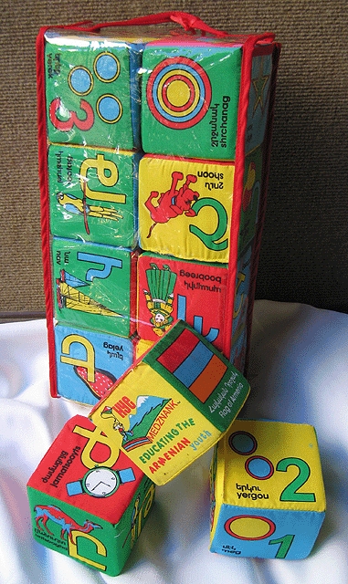 Ideal for babies learning to stack and play. Teaches the Armenian alphabet, colors, numbers, shapes, and sounds. Block size is 3.5". Contains 8 blocks with all the letters of the Armenian alphabet along with an example of an word in Armenian of the image and it's English transliteration (in Western Armenian).