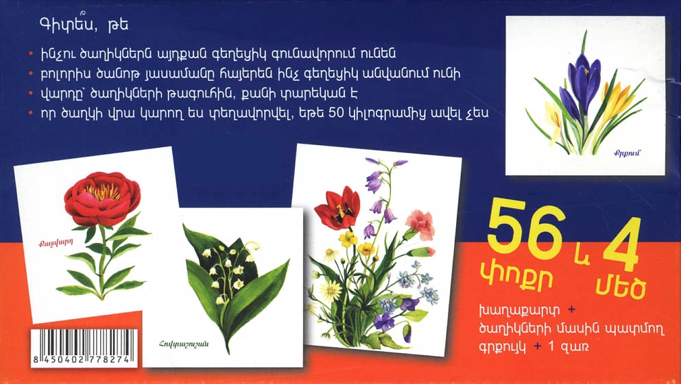 56 փոքր եւ 4 մեծ խաղաքարտ, ծաղիկների մասին պատմող գրքույկ, ու 1 զառ:- Մեմորի- Հավաքիր ծաղկեփունջը- Գուշակիր ծաղիկը